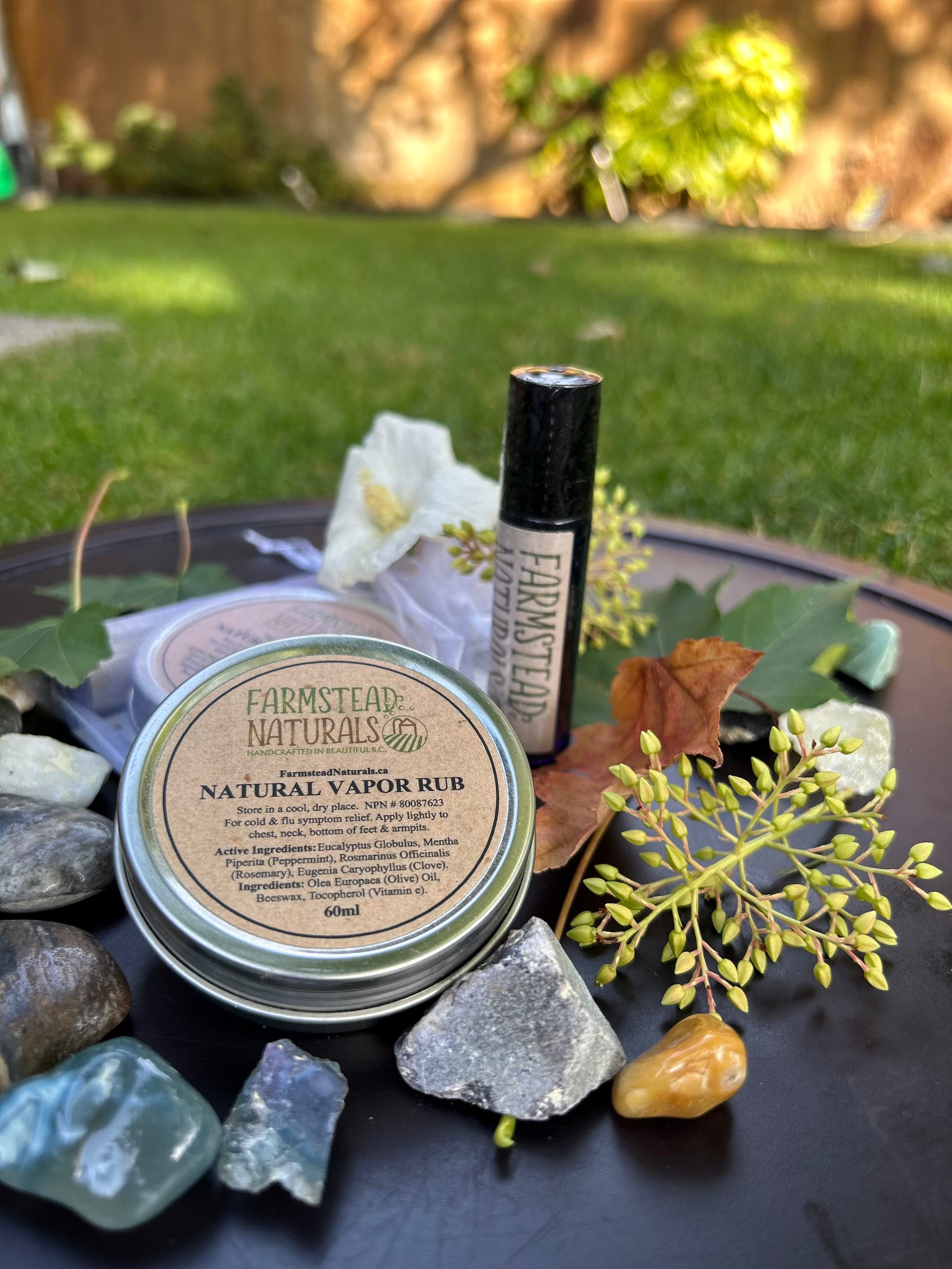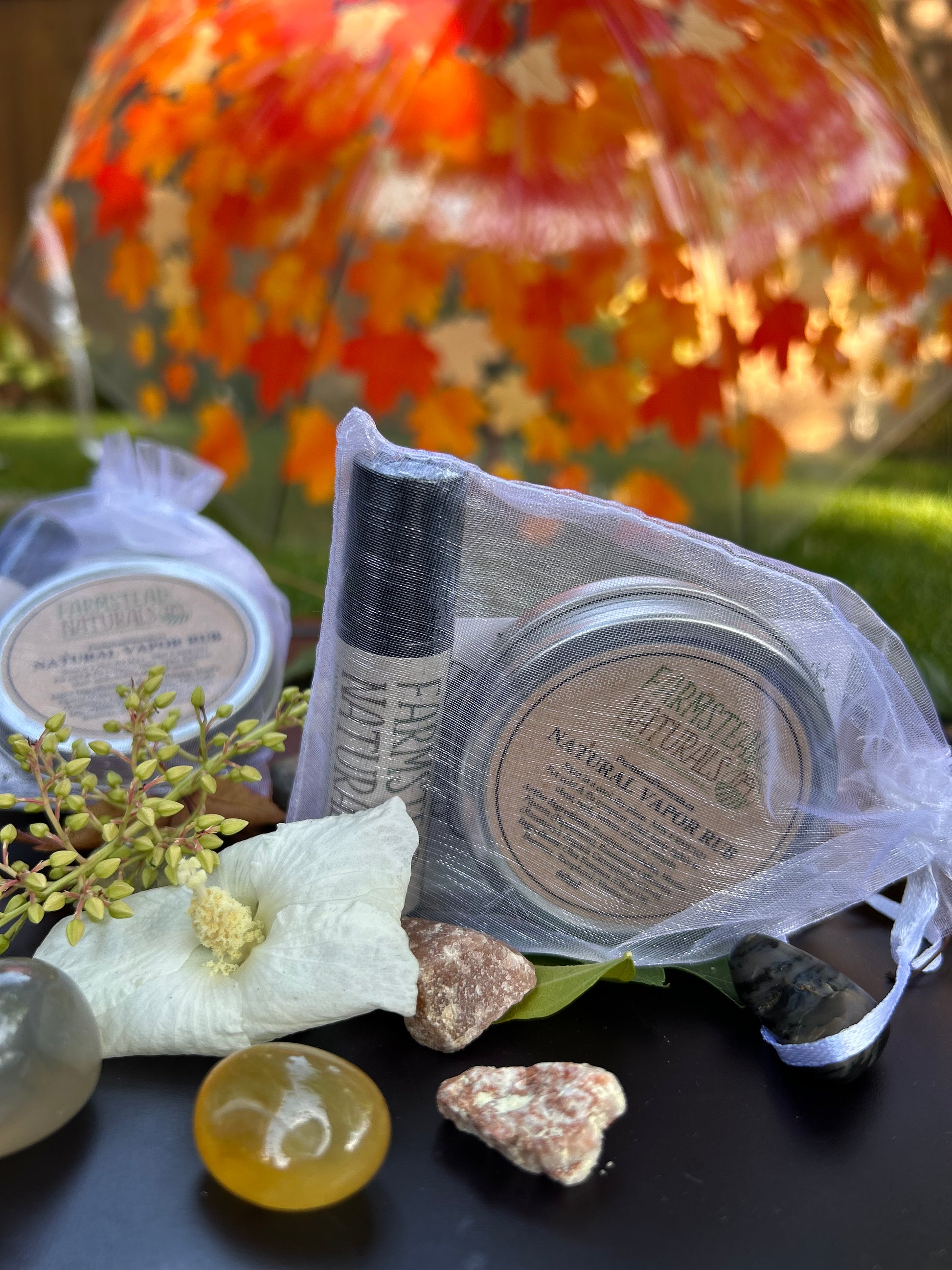 This cold relief set comes wrapped together in a white organza bag. The Soothe Roll on is an immunity blend of Eucalyptus, Lavender, and Tea tree essential oils. The carrier oil is Grapeseed oil. The flu care can be applied to any pulse point including the neck, wrists, spine, armpits, and feet. The Natural Vapor Rub is made with Olive oil, & Shea butter. I then add Beeswax and Essential oils of Eucalyptus, Rosemary, Peppermint, & Clove for a natural flu treatment that will ease the discomfort of any cold or flu. Apply a thin layer to chest, neck, & bottoms of feet. Breathe deeply! Safe for all ages!